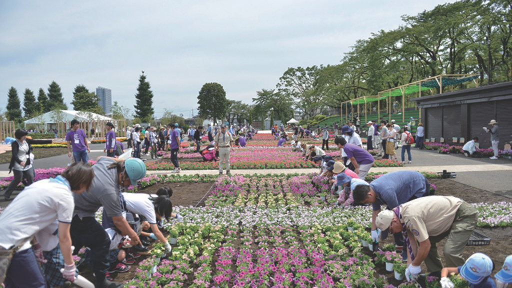 式典では自衛隊によるブルーインパルスの展示飛行のほか、緑化祭では秋篠宮同妃両殿下に御臨席いただき、多摩森林化学園で育てられた八重桜「はるか」を植樹いただきました。また、市内108の小中学校の生徒に参加いただき、1校1本ずつ桜を植えてもらいました。期間中40万人程度の来場を予想していましたが、天候にもかかわらず延べ70万人を超える大盛況となりました。