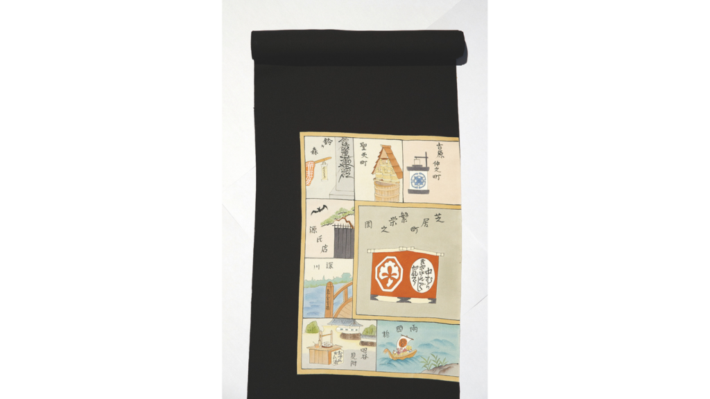 芝居小屋中村座の櫓を中心に様々の歌舞伎の演目も双六風に配した遊び心ある染帯