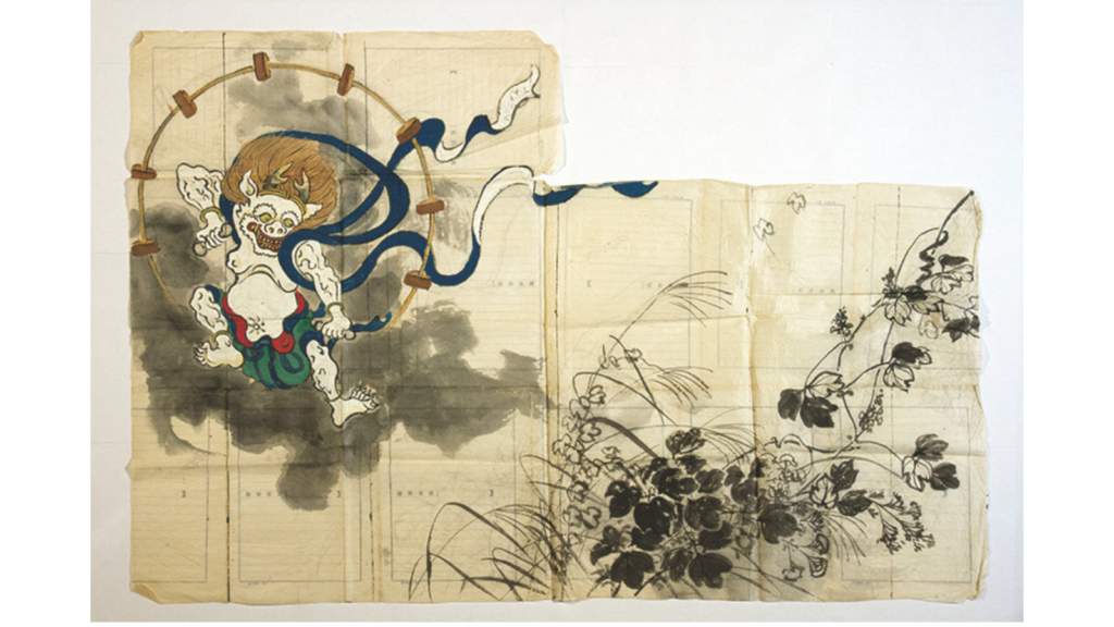 下絵用の大きな和紙がなく手元にあった原稿用紙を貼り合わせて裏に描く。